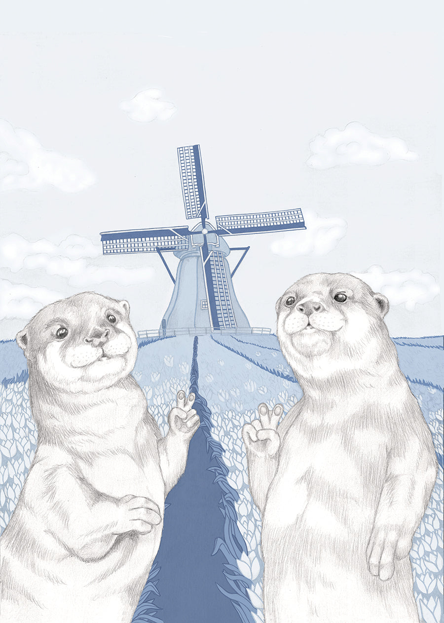 It started with the idea of drawing animals on the Albert Cuyp markt, eating stroopwafels. I loved drawing the city around it so much, that I decited to draw the rest of this beautiful city too, with al the "people" in it. Just as animals, like I usually like imagining. Eventually, they will all be in a book, a kind of love letter to the city I love living in so much! For now they will be available as cards and prints. These are delft blue versions, but I also have colored versions of them.
